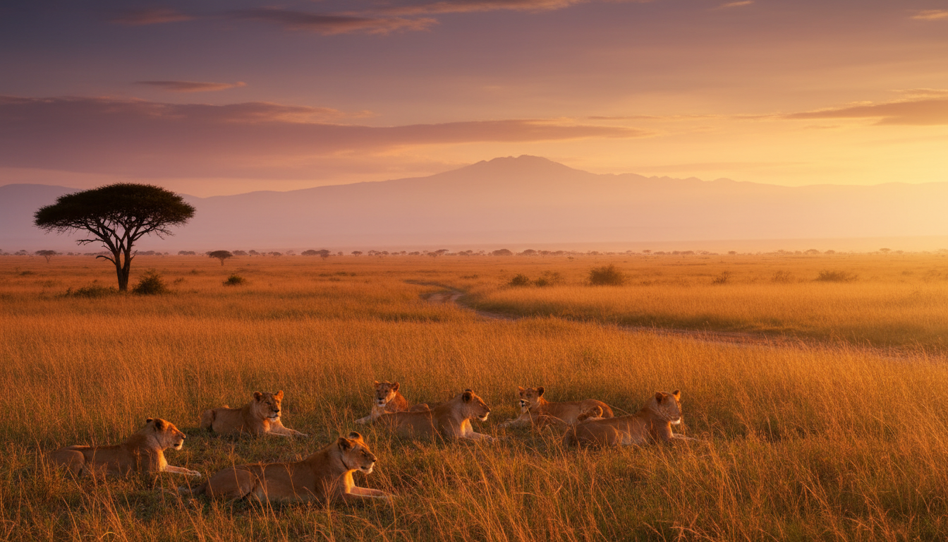 Picture yourself standing on the edge of a vast, rolling savanna, where golden grasses whisper secrets to the wind and the sun descends in a dramatic explosion of amber and violet light. There is a primordial rhythm here—a heartbeat that